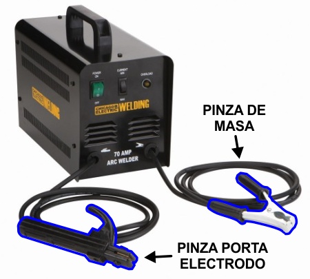 El equipo consta de dos cables con dos pinzas. En un extremo está la pinza porta electrodos y en el otro cable contamos con una pinza cocodrilo para conexión a masa. Una vez conectado, se coloca el electrodo en su pinza y se acerca a la pieza de trabajo.